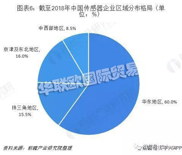 從企業分布來看,傳感器企業主要分布在華東地區、京津及東北地區、珠三角地區、中西部地區四大產業聚集區。其中,華東地區傳感器企業數量最多,約占全國企業總數的60%,珠三角地區約占15.5%,京津及東北地區約占16%,中西部地區約占8.5%。此外,傳感器產業伴隨著物聯網的興起,在其它區域,如陜西、四川和山東等地也逐步發展起來。