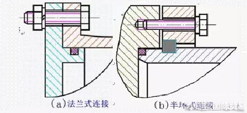 (2)半環(huán)式連接,分為外半環(huán)連接和內(nèi)半環(huán)連接兩種連接形式,半環(huán)連接工藝性好,連接可靠,結(jié)構(gòu)緊湊,但削弱了缸筒強(qiáng)度。半環(huán)連接應(yīng)用十分普遍,常用于無縫鋼管缸筒與端蓋的連接中。