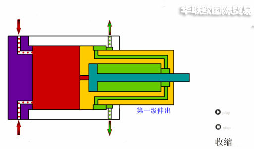 當(dāng)壓力油從無桿腔進(jìn)入時,活塞有效面積最大的缸筒開始伸出,當(dāng)行至終點(diǎn)時,活塞有效面積次之的缸筒開始伸出。伸縮式液壓伸出的順序是由大到小依次伸出,可獲得很長的工作行程,外伸缸筒有效面積越小,伸出速度越快。因此,伸出速度有慢變快,相應(yīng)的液壓推力由大變小;這種推力、速度的變化規(guī)律,正適合各種自動裝卸機(jī)械對推力和速度的要求。而縮回的順序一般是由小到大依次縮回,縮回時的軸向長度較短,占用空間較小,結(jié)構(gòu)緊湊。常用于工程機(jī)械和其他行走機(jī)械,如起重機(jī)、翻斗汽車等的液壓系統(tǒng)中。