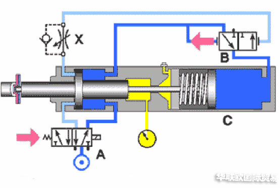 彈簧回程單作用缸:通常限于用來保持和夾緊的很小的短行程缸。容納回程彈簧所需要的長度使得它們在需要長行程時很討厭;